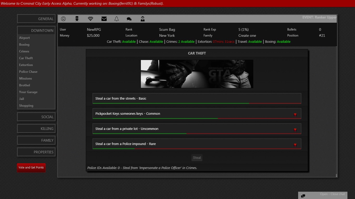 Criminal City is a browser-based text game about criminal activities. You can complete missions by choosing a suitable mission and reading through a short review. Commit crimes such as robbing, smuggling, running a drug farm, looting a dumped car, and so forth. You can also attempt to steal a car from various areas and pickpocket car keys. Try out the extreme police chase, shop for better equipment, join/create a family and try to extort someone in the streets without going to jail.
