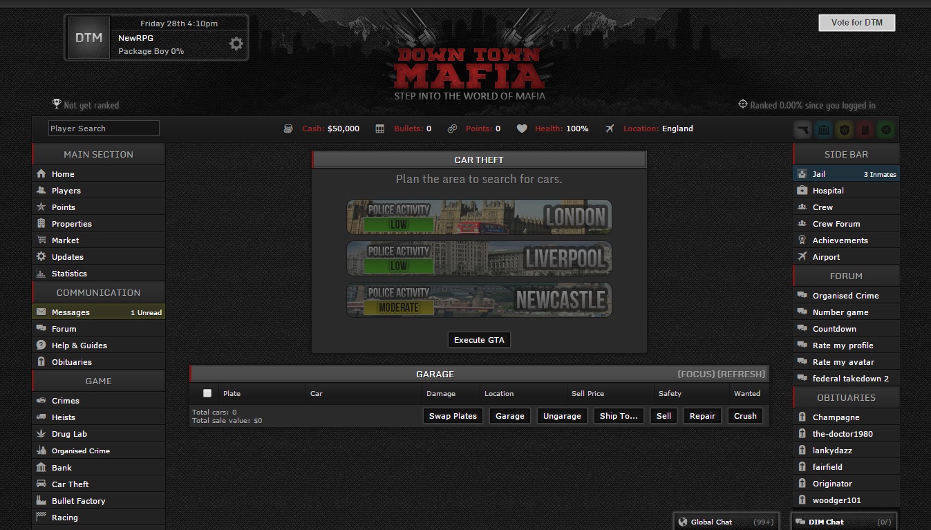 DownTown Mafia is an online mafia browser game. Commit crimes, but keep in mind that there is always a chance for failure. If you want to steal a vehicle you should also consider the police activity in different areas. The game allows you to build your own car and participate in races. Complete missions, visit bullet factory and attempt killing actions. Gambling contains blackjack, lottery, roulette, poker, race track and keno. Travel to other areas, purchase good weapons, earn achievements and become a real gangster.