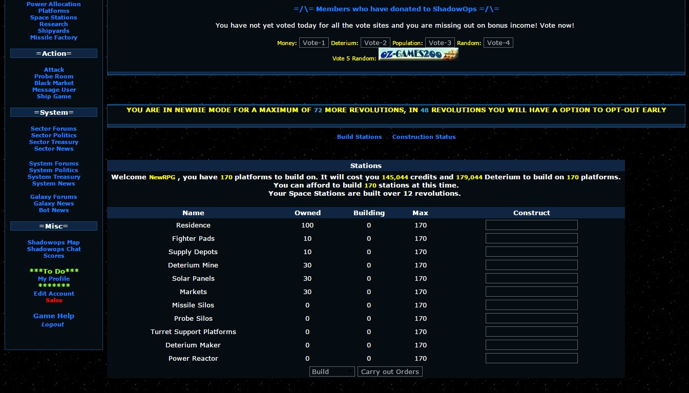 ShadowOps is a free to play browser game set in the space. Work hard and you'll be able to build the best kingdom. Space stations is a building section where you can construct supply depots, markets, deterium mine, power reactor, fighter pads and many other facilities. Constructing buildings costs credit and deterium. There are sneaky probes which help you to spy on other kingdoms. Probes can also steal resources of enemies, kidnap their population and much more.
